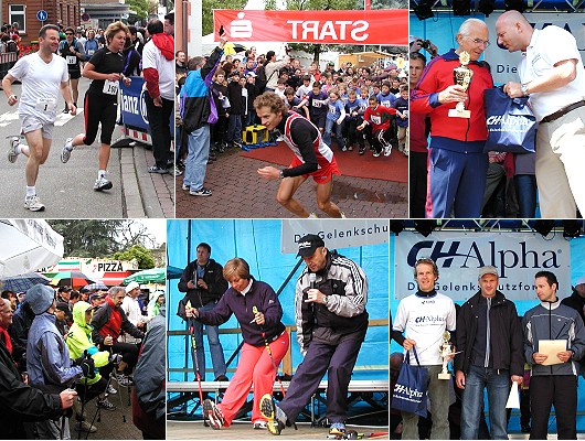 CH-Alpha-Frühlingslauf auf Anhieb ein sportliches Highlight Oben: Bürgermeister Bernhard Martin mit Gattin, Schirmherr Timo Bracht als "Mitläufer" beim Start der Bambini und Michael Teppner (r.) mit dem ältesten Teilnehmer, Berthold Oehlke aus Brombach. Unten: Verregnetes Warm-Up mit Rosi Mittermaier und Christian Neureuther sowie die Sieger des Halbmarathons Timo Bracht (1.), Jan Wäsch (2.) und Marco Hufnagel bei der Siegerehrung. (Fotos:Claussen)