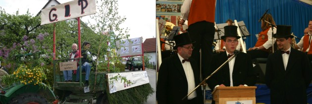 Mit der Eberbacher Puppenkiste GIP´ ts nix Egal ob GIP, Skiparadies oder Windkrafträder- der Kerweumzug hatte allerlei kommunalpolitische Themen zu bieten. Kerwepfarrer Peter I (Mitte) machte sich so manchen Reim auf die Dorfbewohner. (Fotos:Böhm) (ub) Der Wettergott ließ am Sonntag mit den Veranstaltern der Schwanheimer Kerwe Nachsicht walten. Die Sonne schien für die Dauer des Kerweumzuges, so dass die Kerwebesucher nur beim anschließenden Umtrunk im Festzelt von innen nass wurden.