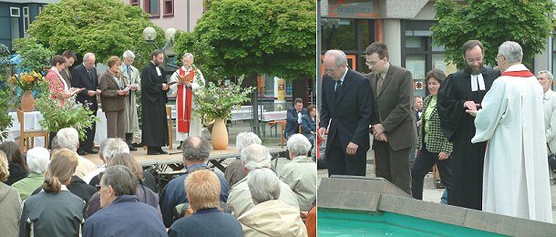 Evangelische und katholische Christen erinnerten sich gemeinsam an das Sakrament der Taufe (Fotos:Wörner)(tw) Zum ökumenischen Pfingstgottesdienst auf dem Leopoldsplatz heute morgen konnten Pfarrer Ekkehard Leytz und Pfarrer Hubert Seitz nicht nur zahlreiche Gemeindemitglieder und Gäste sondern zur Freude aller auch erste Sonnenstrahlen begrüßen. Die sechste gemeinsame Pfingstfeier der Eberbacher Pfarrgemeinden wurde von der Katholischen Pfarrkapelle Eberbach musikalisch mitgestaltet. Die Klänge der Pfarrkapelle begleiteten die Gemeindemitglieder dann auch bei ihrem Gang zum Brunnen auf dem Leopoldsplatz. Die beiden Geistlichen Leytz und Seitz hatten eingeladen sich mit dem Brunnenwasser durch ein Kreuzzeichen auf die Handflächen gegenseitig zu segnen – zur Erinnerung an das Sakrament der Taufe und als Tauferneuerung.