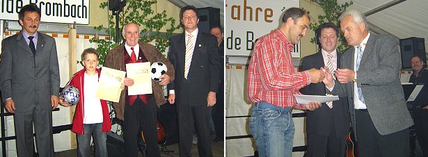 Festbankett zum 25-jährigen Jubiläum der Sportfreunde Brombach Jüngstes und ältestes Mitglied der Sportfreunde, sowie Auszeichnung der Vorstandschaft (Fotos:privat)(jc) (rj) Mit dem Satz "25 Jahre Sportfreunde Brombach, ein klassisches Jubiläum, ein Grund zum Feiern!" eröffnete erster Vorsitzender Roland Weber das Festbankett am vergangenen Samstag im vollbesetzten Zelt am Sportplatz. Viele Brombacher Bürger, Gäste sowie geladene Ehrengäste waren gekommen, um mitzufeiern.