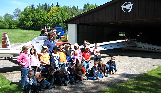 (jc) Einmal Pilot sein, dieser Wunsch von Frau Gängs Zweitklässlern wurde durch den Segelflieger-Club Eberbach bei herrlichem Wetter auf dem Segelfluggelände Rothenberg Wirklichkeit. Bevor der Pilot sein Flugzeug besteigt, muss er Höhenruder, Seitenruder und Querruder in Augenschein nehmen. Nach detailliertem Flugzeugcheck wurden von den Kindern die Landeklappen ausgefahren und die Ruder mit Hilfe des Steuerknüppels bewegt. Die Funksprechprobe mit dem Startwagen konnten die Zweitklässler kaum erwarten. Um Telefonkontakt zur Seilwinde aufzunehmen, musste das antike Telefon gekurbelt werden, erst dann kommt eine Verbindung zustande.Die nötigen Grundkenntnisse erlangten die Schüler mittels selbstgebasteltem Düsenjet der Lehrerin, anhand von Fallschirmen sowie mit einem Robbe Modellflugzeug in der Grundschule Rothenberg. So bekam man im Nu die Thermik anschaulich dargestellt, wie auch das Vorhalten der Flugzeuge bei Seitenwind während des Starts und der Landung.