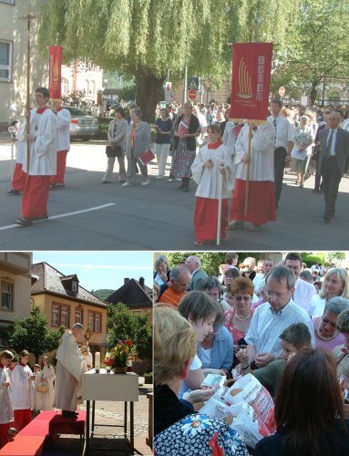 (tw) Mit einer Eucharistiefeier auf dem festlich geschmückten Turnplatz vor der Kirche St. Johannes Nepomuk und einer anschließenden Prozession durch die Innenstadt begingen heute die Mitglieder der Katholischen Pfarrgemeinden St. Johannes Nepomuk und St. Josef in Eberbach das Fronleichnamsfest. Der Gottesdienst und die feierliche Prozession mit Stationsaltären am Bahnhofsplatz, zum ersten Mal vor dem Dr. Schmeisser-Stift und auf dem Thonon-Platz wurden von der katholischen Kantorei unter der Leitung von Godehard Weithoff sowie der Pfarrkapelle unter der Leitung von Gustav Rumstadt musikalisch umrahmt. Das Brot, im christlichen Glauben Symbol für den Leib Christi und Anlass für das Fronleichnamsfest welches im 13. Jahrhundert von Pabst Urban IV. gestiftet wurde fand heute einen besonderen Eingang in die Fronleichnamfeier. Brot, gebacken aus fünf Sorten Körnern, symbolisch für die fünf Kontinente und kreiert von einem Bäcker aus Mudau mit dem Ziel für jedes verkaufte Brot eine Summe von 30 Cent für den Weltjugendtag zu spenden. Solches Brot, gebacken von einer Eberbacher Bäckerei und während des Gottesdienstes von Pfarrer Hubert Seitz geweiht konnten die Besucher nach der Fronleichnamsfeier erwerben.