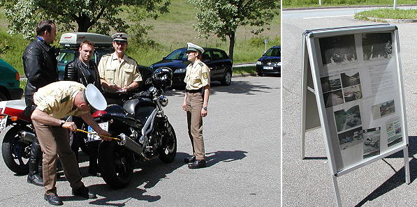 Kontrollaktionen auf Odenwaldstrecken laufen ungebremst weiter Harald Meyer und seine Kollegen bei der Kontrolle von zwei Motorrädern sowie eine Aufklärungstafel mit der Fotodokumentation schwerer Unfälle auf den Odenwaldstrecken (Fotos:Claussen)(jc) Die im Rahmen der Sicherheitskooperation der Bundesländer Hessen und Baden-Württemberg durchgeführte Kontrollaktionen "Motorisierte Zweiräder" (wir berichteten bereits) läuft ungebremst weiter. Heute wurden auf der L 2311 am Parkplatz Itterhof wieder massive Kontrollen durchgeführt. Zwischen 14.40 Uhr und 17.40 Uhr wurden insgesamt 27 Motorräder kontrolliert. An sieben Krafträdern war eine unzulässige Auspuffanlage montiert, was zur Folge hat, dass die Betriebserlaubnis der Fahrzeuge erlischt. Die Fahrzeughalter erwartet eine Ordnungswidrigkeitsanzeige, 50 Euro Bußgeld und drei Punkte in Flensburg. Zusätzlich wird ein Mängelberichtsverfahren eröffnet. Bei Nichtbeachtung der Auflagen bzw. Beseitigung der Mängel, kann die Zulassungsstelle die Motorräder zwangsstilllegen. Einsatzleiter Harald Meyer und seine Kollegen haben sich zum Ziel gesetzt mit den Kontrollen, die in den nächsten Wochen weitergeführt werden sollen, in diesem Jahr auf der vielbefahrenen Strecke ohne Unfalltote über die Zweiradsaison zu kommen. Jeder schwerverletzte Motorradfahrer sei einer zuviel. In den vergangenen Jahren gab es immer wieder Tote und Schwerverletzte auf den jetzt kontrollierten Odenwaldstrecken. Für Meyer, der selbst seit 25 Jahren leidenschaftlicher Motorradfahrer ist, sind die Ergebnisse der Kontrollen erschreckend. Bilanzierend bedeute das heutige Ergebnis, dass jeder Vierte mit einer illegalen Auspuffanlage unterwegs sei. Dass die Anwohner im Odenwald für Streckensperrungen plädierten, wundere in seit langem nicht mehr.