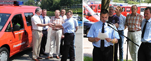 Neuer Kommandowagen für die Hirschhorner Feuerwehr Unser Foto zeigt die Schlüsselübergabe durch 1.Stadtrat Willi Dreher an Stadtbrandinspektor Marco Albert (rechts im Bild), sowie Albert bei seiner Ansprache im Schutze schattenspendender Bäume (Fotos:Claussen)