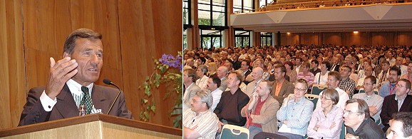 Der letzte Mohikaner über sein Erfolgsrezept - Wolfgang Grupp referierte (Fotos:Claussen)(jc) Einen überaus kurzweiligen und interessanten Abend erlebten gestern die rund 650 Besucher im Mittelstandsforum der Volksbank Neckartal. Mit Wolfgang Grupp, Inhaber des Bekleidungsherstellers Trigema, war eine der interessantesten deutschen Unternehmerpersönlichkeiten in die Stadthalle gekommen. Durch seine seit Jahren in der Öffentlichkeit vehement "gegen den Strom" gerichtete Auffassung von der Qualität des Produktionsstandorts Deutschland polarisiert der Manager sehr stark. Während er von weiten Teilen der Bevölkerung Applaus erntet, richtet sich im derzeitigen Trend der Arbeitsplatzverlagerungen aus den Reihen der Unternehmer auch Kritik an seine Adresse. Dem entsprechend spürbar waren die Erwartungen der Besucher groß.