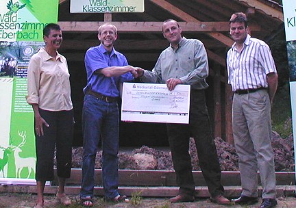 Jäger spendeten fürs Waldklassenzimmer V.l. Edith Schiml, Dr. Peter Sack, Ingo Walter und Holger Schettler. (Foto:Geesey)(hr) (Quelle:Eberb.Ztg.) Ihre Verbundenheit zum Waldklassenzimmer im Gretengrund zeigten die rund 80 Mitglieder des Hegerings V: Vorsitzender Ingo Walter und sein Stellvertreter Holger Schettler überreichten am 1. Juni 750 Euro an die beiden Vorsitzenden des Fördervereins, Dr. Peter Sack und Edith Schiml.