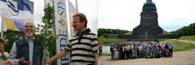 Ein Ginkgobaum für Bad Düben Günter Lipski und Reiner Heun pflanzen einen Ginkgo-Baum in Bad Düben. Die Ausflügler vor dem geschichtsträchtigen Völkerschlachtdenkmal in Leipzig. (Fotos:Böhm)(ub) (hr) Reiner Heun rief und ein großer Reisebus mit Mitgliedern und Freunden des Eberbacher Bürger- und Heimatvereins unter umsichtiger Führung seines Vorsitzenden Günter Lipski machte sich dieser Tage auf den Weg nach Sachsen und Sachsen-Anhalt. Heun, Ehrenvorsitzender des Bürger- und Heimatvereins Eberbach, seit 1998 Kurdirektor von Bad Düben und Geschäftsführer der "HeideSpa" (Sachsens größtes Kur- und Wellness- Zentrum, 30 km nördlich von Leipzig), freute sich auf einen Besuch der Eberbacher und hatte die 3-Tages-Reise mit Schwerpunkt Leipzig bestens organisiert.