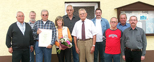 Über 30-jähriges ehrenamtliches Engagement gewürdigt Mit einer der höchsten Auszeichnungen auf Landesebene wurde Fred Auer (3.v.l.) mit Ehefrau ausgezeichnet. Unser Foto zeigt ihn zusammen mit dem 2. Landesvorsitzenden des Siedlerbundes Otto Grab (5.v.r.), dem Kreisvorsitzenden und Strümpfelbrunner Gemeinschaftsleiter Günter Gepperth (rechts), sowie der Vorstandschaft der Siedlergemeinschaft Strümpfelbrunn. (Foto:Baumgartner)(tb) Eine hohe Ehrung wurde am Samstag dem ehemaligen Kassenwart Fred Auer der Siedlergemeinschaft Strümpfelbrunn zuteil. Im Rahmen eines Helferfestes im Siedlerheim konnte ihm die Silbermünze mit der Ehrenurkunde des Landesverbandes Baden-Württemberg verliehen werden. Diesem Ereignis war auch der stellvertretende Landesvorsitzende Otto Grab zugegen. Er überbrachte dabei auch die Grüße des Landesvorsitzenden Siegfried Rauch an die Versammlung. Grab sagte dabei dass es sich bei der Auszeichnung mit der Silbermünze des Landesverbandes um eine der höchsten Auszeichnung handle, die der Landesverband zu vergeben hat. Fred Auer sei seit dem 01.09.1967 Mitglied der Strümpfelbrunner Siedlergemeinschaft und war von 1974 bis Anfang dieses Jahres, wie sein Vater vorher auch, Schatzmeister der Siedlergemeinschaft. In dieser Zeit, vor allem aber in den letzten zehn Jahren, habe sich die Strümpfelbrunner Gemeinschaft weiterentwickelt. In diese Zeit sei auch der Erwerb des Siedlerheims, verbunden gewesen. Verbunden waren damit auch zahlreiche Arbeiten und Umgestaltungen, die Fred Auer maßgeblich mitgestaltet habe.