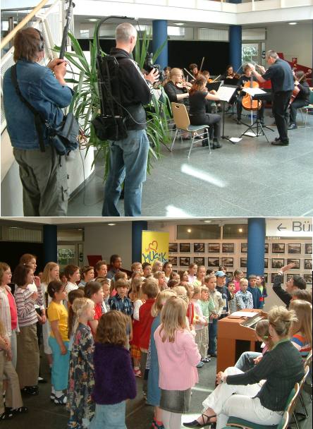Kammerorchester und Kinderchöre präsentierten sich im lichtdurchfluteten Rathaus-Foyer Das Kammerorchester der Musikschule Eberbach unter der Leitung von Tobias Soldner (im Vordergrund das dänische Fernsehteam) und die Kinder- und Spatzenchöre der Singschule Eberbach unter der Leitung von Achim Plagge. (Fotos:Wörner)(tw) Einen würdigen Rahmen bot heute einmal mehr das Foyer des Eberbacher Rathauses für die Matinee der Musikschule mit dem Kammerorchester und den Spatzen- und Kinderchören der Singschule. Mit Werken u. a. des böhmischen Violinisten und Komponisten Johann Stamitz, Antonio Vivaldis und von Wolfgang Amadeus Mozart zog das Kammerorchester unter der Leitung von Tobias Soldner das Publikum in seinen Bann. Bemerkenswert waren hierbei die Soli unter anderem Frederik Schmitts Violinpartie mit seiner Interpretation des "Winters" aus Vivaldis vier Jahreszeiten.