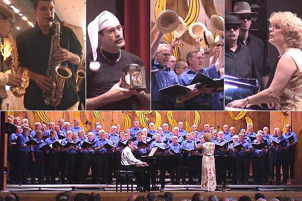 Männerchor mal anders (Fotos:Richter)(hr) Auf ungewohntes Terrain begab sich der Eberbacher Männergesangverein Liederkranz mit seinem Chorkonzert vorgestern Abend in der Stadthalle. Aus Anlass des 160-jährigen Chorbestehens lieferten die Sänger unter dem Motto "Ausgerechnet Bananen" und unter der Ägide von Chorleiterin Karin Conrath den Beweis dafür, dass es auch im Schlager- und Popbereich vieles gibt, was man mit großem Spaß für Akteure und Publikum einstudieren und darbieten kann. So entstand eine bunte Revue aus Hits und Evergreens von bekannten Traditionals über die Wilden Zwanziger und Filmmelodien bis zu fast aktuellen Songs aus den 90er Jahren wie der Hit "Mann im Mond" von den "Prinzen".