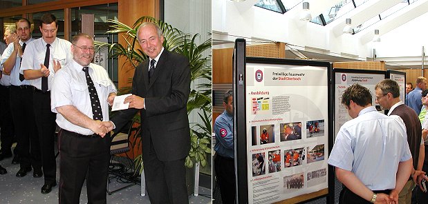Freiwillige Feuerwehr Eberbach mit ihren Abteilungen präsentiert sich Wolfgang Kleeberger (r.) bei der Übergabe einer Spendengutschrift an Jörg Kubein sowie Blick in die Ausstellung (Fotos:Claussen)(jc) Die Ausstellung "Freiwillige Feuerwehr Eberbach mit ihren Abteilungen" ist seit gestern in der Sparkassen- Kundenhalle in der Friedrichstraße zu sehen. Im Rahmen einer Eröffnungsfeier konnten Sparkassendirektor Wolfgang Kleeberger und Gesamtkommandant Jörg Kubein zahlreiche geladene Gäste begrüßen.