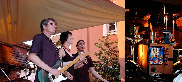 Klasse Band mit Klebe-Band Links: (v.l.) Martin Haaß, Jutta Werbelow, Rolf Schaude, rechts: Jutta Werbelow und ihr Schlagzeug. (Fotos:Koss)(ak) Auf Einladung des Kulturlabors konzertierten "Die Nachtigallen" gestern Abend am Pulverturm. Petrus war ihnen hold, denn die befürchteten Gewitter blieben aus und das Publikum durfte einen warmen Sommerabend genießen. Dennoch waren die Plätze zu Anfang nur halb besetzt, im Lauf des Abends aber kamen weitere Zuhörer. Die Bandmitglieder Martin Haaß, Jutta Werbelow und Rolf Schaude kommen aus Wiesloch und Rauenberg und spielen seit fast zwölf Jahren zusammen. Die Chemie scheint zu stimmen, das Trio hat es geschafft, die Leidenschaft für Musik in all den Jahren merklich zu erhalten. Perfektes Zusammenspiel ohne die geringste Unsicherheit, fantasievolle Interpretationen und sympathische Selbstironie kennzeichnen ihren Stil. Einzig die mangelnde Klebkraft des Isolierklebebands bei hohen Temperaturen, mit dem Jutta Werbelow ihre Schlagzeugkreation zusammenhält und umbaut, machte gelegentlich Probleme.