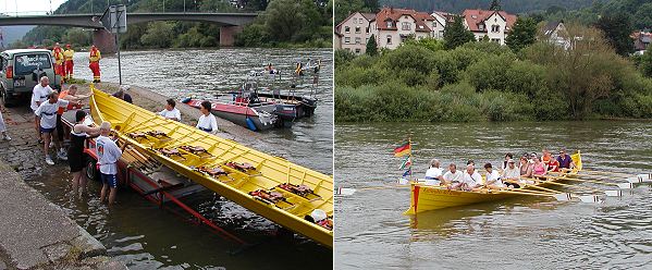 RG Eberbach mit dem Kirchboot auf Gauditour nach Hirschhorn (Fotos:Claussen)(jc) (ewa) Einen Vierer oder Achter kennt jeder, der sich schon einmal mit der Ruderei befasst hat. Aber ein Boot, in dem 14 Leute sich abrackern, dazu noch ein Steuermann und ein Kind als "Kielschweinchen"? Das gibt es nicht oft. Vergangenen Samstag war solch ein Gefährt zwischen Eberbach und Hirschhorn zu beobachten. Mitglieder der Rudergesellschaft hatten sich ein so genanntes Kirchboot von einem Karlsruher Club ausgeliehen, um sich eine besondere Gaudi zu gönnen. Mit einem Kirchboot überquerten früher Dorfbewohner einen Fluß oder See, um am Sonntagsgottesdienst teilnehmen zu können, wenn sie keine eigene Kirche in ihrem Ort hatten.