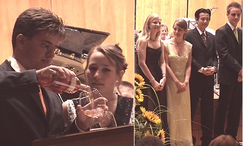 Die beiden Abiturienten Marlen Rabl und Dimitri Münch wagten formvollendet und unter großem Beifall einen kritischen Rückblick auf ihre Schulzeit, nachdem sie sich zunächst Wein in ihre Gläser gegossen hatten, weil sich das "nüchtern kaum bewerkstelligen" lasse. In Thesenform kritisierten sie zu viele Hohlstunden, die Raumnot am Gymnasium, fehlende Exkursionen und das unausgereifte Schulsystem. Sie sparten aber auch nicht mit Selbstkritik und lobten das private Engagement der Lehrer und des Vereins der Freunde des Hohenstaufen-Gymnasiums.