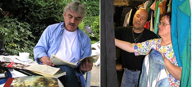 Klassischer Freischütz, ländliche Braut Links: Regisseur Andreas Franz in Zwingenberg bei den Vorbereitungen zum „Freischütz“, rechts: Regisseur Thomas Kiemle mit Anneliese Seibert bei der Auswahl der Kostüme. (Fotos:Schlossfestspiele)(ak) (sb) Kostüme auswählen, den Schauplatz Schlosshof besichtigen, erste Gespräche mit dem Bühnenbildner – für die Regisseure Thomas Kiemle und Andreas Franz hat die Saison 2005 der Schlossfestspiele Zwingenberg begonnen.