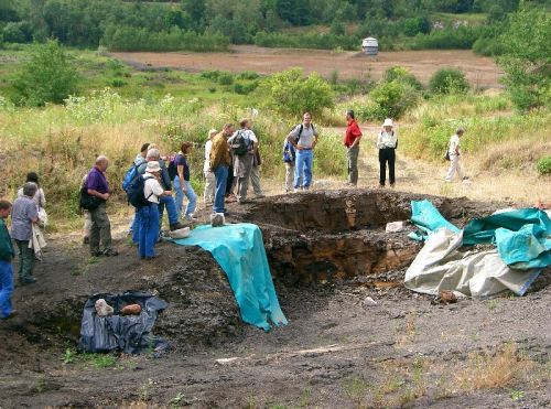 Gleich nach Ankunft bot sich von der Aussichtsplattform ein erster Blick in die vom Ölschiefer grauschwarzgefärbte, schüsselförmige Senke, die einen Durchmesser von etwa 800 Metern aufweist. In zwei Gruppen aufgeteilt, geführt von zwei engagierten Paläontologen, wurde die Grabungsstätte anschließend durchwandert. Dabei erfuhr man viel über die Arbeitsweise der Forscher vor Ort und vor allem viel über die Entstehungsgeschichte der Grube, die auf Maarvulkanismus zurückgeht. Die zahlreichen und vielfältigen Funde der letzten 125 Jahre stammen aus der Zeit vor etwa 47 Millionen Jahren. Damals entwickelten sich die Säugetiere nach dem Aussterben der Dinosaurier explosionsartig.