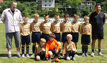 Auch Trainer Michael Zimmermann (rechts ) freut sich mit dem Kickernachwuchs. Links der Spender der Trikots Stefan Wierz, Finanzberater für Bonnfinanz.