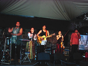 Keltische Träume und Tänze V.l.: Bergo Ibrahim (Diembe, Darbouka, Gesang), Diana Hübner (Gesang), Berk Demiray (Gitarre, Gesang), Helen Mannert (Geige, Akkordeon, Gesang), Rainer Burgmer (Flöte, Dudelsack, Gesang) (Foto: Koss)(ak) Die Frage, ob das Wetter halten wird, wenn Dhalia’s Lane am Pulverturm spielen will, war spannend bis zum Schluss. Aber die Band und das Kulturlabor als Veranstalter bewiesen gestern Abend Mut und zogen sich nicht in geschlossene Räume zurück. Die knapp 200 Gäste wurden belohnt mit einem Konzert von mitreißender, temperamentvoller alter und neuerer irischer Musik in der schönen Atmosphäre des Innenhofs am Pulverturm. Dhalia’s Lane spielte viele Lieder der neuen CD „Hollymount“ - auch der Titel des Stückes, mit dem sie begannen. Schnelle Rhythmen wie „Willy Taylor“ und getragene Balladen wie „The Town I Loved So Well“ wechselten und bald folgten die ersten Zuhörer ihrem Impuls, zu tanzen. Als Bergo Ibrahim den Regenmacher, eine Art großer Rassel, spielte, kam der befürchtete Regen tatsächlich. Aber passend zur Herkunft der Musik irisierte der kurze Sommerregen die Stimmung nur noch mehr und tat der Begeisterung keinen Abbruch. Mal einfühlsam, mal in atemberaubendem Tempo spielten Bergo Ibrahim auf den Trommeln, Berk Demiray die Gitarre, Helen Mannert ihre Geige und Rainer Burgmer auf den Flöten und dem schwierig zu spielenden Dudelsack. Diana Hübner fügte den Stücken gefühlvollen Gesang mit ihrer klaren Stimme bei. Auch exotische Klänge beherrscht Dhalia’s Lane, die Musiker zeigten es mit „Al Suk“, einem Lied aus Ägypten, der Heimat Bergo Ibrahims.