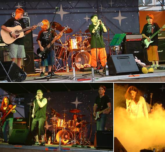 Heiße Rocknacht am Neckarufer Die "Rockkidz" mit Nicola Bruder (Gesang), Gregor Kohl (Gitarre), Luca Paul (Bass), Malon Weiher (Schlagzeug) und Miron Weiher (Gitarre, Gesang) legten eine erstaunliche Professionalität an den Tag, unten links die Gruppe "One Way" und Frontfrau Monika Emmerich von "Grandmas last hope". (Fotos:Wörner)(tw) Voll auf ihre Kosten kamen die zahlreichen Zuschauer gestern Abend beim Fabrikrock auf dem Freigelände im Meto Werk I. Nicht wie angekündigt drei sondern eigentlich vier Top-Acts aus der Region spielten live unter freiem Himmel und ohne größere Umbaupausen in schneller Folge. Los ging es mit Slammin Baboon und einem ungewöhnlichen musikalischen Programm abseits aktueller Strömungen, so kann man die mitreißenden Rock-Songs, die sparsam instrumentierten Reggae-Rhythmen, den Punk, den Grunge-Rock und die sanften Balladen bezeichnen. Nicht wenigen in der Region sind die Namen der Bandmitglieder der neueren Gruppierung bekannt, denn "Slammin Baboon" spielt in der Besetzung: Nicole Guida (Gesang), Bernd Knapp (Gitarre, Gesang), Karl Schramm (Bass, Gesang) und Benny Safferling (Schlagzeug). Die "Rockkidz" - hier passt der Name noch genau - spielten gemischten Cover-Rock mit deutschen und englischen Texten. Den Namen sollte man sich merken denn das Durchschnittsalter der Jungs ist gerade 11,5 Jahre und vielleicht war einer der ganz großen von morgen beim Fabrikrock dabei. "Rockkidz" spielen normalerweise als Vorgruppe von "One Way" und waren als kleine Zugabe von diesen mitgebracht worden. Hard and Heavy aus den 80er und 90er Jahren, von Judas Priest über Black Sabbath bis AC/DC gab es dann von "One Way". Zum ersten Mal beim Fabrikrock in der Besetzung mit Holger Gramlich (Schlagzeug), Markus Michel (Bass), Roger Siegel (Gesang) und Hamma (Gittarre).