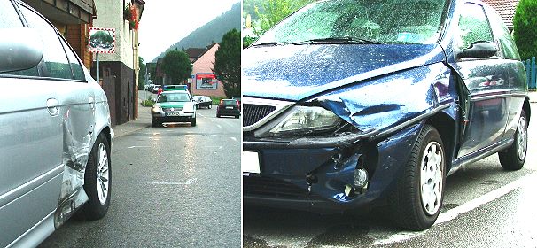 Ein Leichtverletzter nach Vorfahrtfehler (Fotos:Richter)(hr) Leicht verletzt wurde ein 23-jähriger Eberbacher heute am späten Nachmittag bei einem Verkehrsunfall in der Neckarstraße. Ein 65-jähriger Urlauber aus Nordrhein-Westfalen wollte mit seinem BMW vom Parkplatz an der Neckarbrücke nach links in die Neckarstraße einbiegen und übersah dabei den vorfahrtberechtigten Lancia-Kleinwagen des Eberbachers, der in Richtung B 37 unterwegs war. Der Lancia krachte dem BMW im Fondbereich in die Fahrerseite. An beiden Fahrzeugen entstand erheblicher Sachschaden.