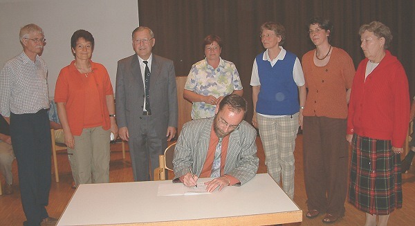 Ökumenisches Miteinander wurde schriftlich fixiert Pfarrer Ekkehard Leytz unterzeichnet die Ökumenische Rahmenvereinbarung für Eberbach. Hinten von links Paul Bungert, Gertraud Springer, Pfarrer Hubert Seitz, Cornelia Wick, Dr. Ingrid Ebschner, Pfarrerin Sabine König, Christa Haas. (Foto:Wörner)(tw) Seit dem 27. Mai 2004 gibt es eine Rahmenvereinbarung für ökumenische Partnerschaften zwischen evangelischen Pfarrgemeinden in der Evangelischen Landeskirche in Baden und römisch-katholischen Pfarreien in der Erzdiözese Freiburg, unterzeichnet von Landesbischof Dr. Ulrich Fischer in Karlsruhe und von Erzbischof Dr. Robert Zollitsch in Freiburg.