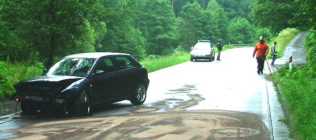 Zu schnell bei Regen - Totalschaden und ein Leichtverletzter (Foto:Richter)(hr) Nicht angepasste Gesschwindigkeit auf regennasser Fahrbahn war offenbar die Ursache für einen Verkehrsunfall heute gegen 16.30 Uhr auf der L 595. Aus Richtung Allemühl kommend geriet ein 22-jähriger Eberbacher mit seinem Audi nach einer Linkskurve ins Schleudern. Der Wagen prallte kurz vor dem Ortseingang Pleutersbach frontal an die bergseitige Böschung und kam total beschädigt auf der Straße zum Stehen. Der Fahrer verletzte sich leicht. Den Sachschaden schätzt die Polizei auf rund 6.000 Euro.