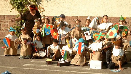 Schüler der Dr. Weiß-Grundschule reisen in die Vergangenheit (Foto: privat)(bro) (csch) Gemäß dem neuen Bildungsplan, der vorgibt die Schüler zum selbstständigen Erwerb von Fähigkeiten und Kenntnissen anzuregen, veranstalteten die 1. Klassen und die Grundschulförderklasse gemeinsam mit ihren Lehrerinnen ein "Mittelalter-Projekt". Die Schüler gestalteten im Unterricht ein Portfolio, das natürlich zeitgemäß in ein "Scriptum" umbenannt wurde und in dem alles zum Thema "Mittelalter" gesammelt wurde. Während der Projektstunden verwandelten sich die Klassenzimmer der Klassen in eine Kleiderkammer, in der Kleider und Kopfbedeckungen mühsam und liebevoll hergestellt wurden und in eine Waffenkammer, wo Wappenschilder gemalt wurden. In der Stadtbaumeisterei erfuhren die Schüler Wissenswertes über die mittelalterliche Stadt und das Handwerk zur damaligen Zeit. Auch das Wappen Eberbachs wurde näher betrachtet. In einem weiteren Klassenzimmer wurden Instrumente selbst gebastelt und mittelalterliche Lieder gelernt und begleitet. Und auch im Sportunterricht bewegte man sich auf "mittelalterliche" Art und Weise, sei es auf Stelzen oder im Mattenzweikampf. Die Schüler erlebten in diesen vier Wochen wie man Vergangenes vergegenwärtigen kann. Als Abschluss dieser Einheit veranstalteten die 1. Klassen und die Grundschulförderklasse am Freitag, 15.Juli, ein großes "Spectaculum" auf dem Schulhof der Dr. Weiß Grundschule. Durch tatkräftige Unterstützung gelang es, den Schulhof in Parzellen zu unterteilen. Dort maßen sich alle Schüler, die natürlich standesgemäß in ihren selbstgenähten Kleidern und ihren selbst gebastelten Kopfbedeckungen erschienen, in den unterschiedlichsten Disziplinen: Stelzenlauf, Steckenpferderennen, Blinde Kuh, Verteidigung mit dem Schutzschild, der Höllenschlund wurde übersprungen, am mittelalterlichen Flipper konnte man die Geschicklichkeit erproben und auch das leibliche Wohl kam nicht zu kurz, denn die Schüler schmierten ihre eigenen Ritterbrote und bestreuten diese mit Salz und Schnittlauch oder mit Zucker und Zimt. Nachdem alle Stationen bewältigt wurden, oblag es Rektor König, die Schüler allesamt zu Knappen zu ernennen, indem er ihnen die ritterlichen Gebote vorlas und ihnen abschließend einen Orden umhängte. Die Schüler waren mit Spaß und Eifer bei der Sache. Auch die zahlreich erschienen Eltern hatten sichtlich Spaß am Treiben der Kinder und halfen tatkräftig mit, wenn es irgendwo klemmte.