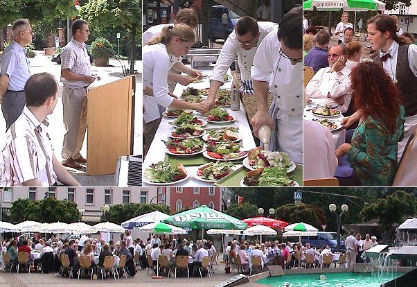 Ein Schlemmermenü unter freiem Himmel Oben links Initiator Herbert Hinterschitt und der Vorsitzende der Bürgerstiftung, Dr. Stefan Ritsert (r.), bei der Begrüßung. 180 Essen wurden auf dem Leopoldsplatz vorbereitet und zügig serviert. (Fotos:Richter)(hr) In Eberbachs größte Gartenwirtschaft verwandelte die Bürgerstiftung heute den Leopoldsplatz zur "1. Eberbacher Bürgertafel". Dahinter steckt eine Idee von Herbert Hinterschitt. Der Vorstandsvorsitzende der Volksbank Neckartal wollte ein großes gemeinsames Mittagessen für möglichst viele Bürgerinnen und Bürger organisieren und dabei über einen Benefiz-Anteil von 5 Euro je Essen das Kapital der Bürgerstiftung aufstocken.