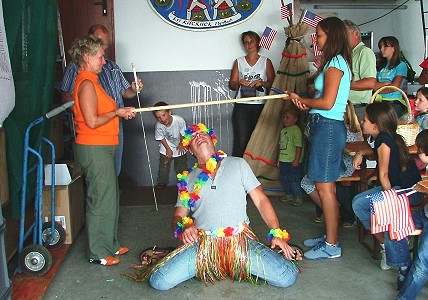 Kuckucke feierten Sommerfest (Foto:C.Richter)(cr) Amerikanische Flaggen schmückten gestern das Nest der Karnevalgesellschaft Kuckuck. Der Duft von Chicken Nuggets, Cheeseburger, Pancake und Popcorn zog über den Jahnplatz und sorgte für das richtige Ambiente beim diesjährigen Sommerfest der Kuckucke. Barbara Menges und Claudia Röderer organisierten zusammen mit etwa 30 Mitgliedern der Jugendabteilung der Karnevalsgesellschaft wieder eine gelungene Fete, bei der auch Spiel und Spaß nicht zu kurz kamen. Passend zum Motto "Amerika" lernten die Gäste bei Spielen rund um das ferne Land, dass man sich die New Yorker Aktienkurse unbedingt merken sollte, wie Indianer und Cowboys sich ergänzen können oder wie Limbo-Tänzer im Baströckchen aus Hawaii sich ohne Bandscheibenvorfall unter einem Stock durchschlängeln können. Am Abend sorgte die Band "Just Clear" mit Jan-Peter Röderer und Lisa Rohr für Unterhaltung.