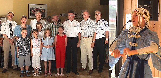 Ferienkinder aus Mosyr luden zum Showabend OTK-Helfer mit Gastkindern und Vertretern der Sponsoren: v.l. Martin Hildenbrand, Natalia Siefert, Volkmar Andrè, Hans Braun, Peter Storch, Wolfgang Kleeberger, Dr. Fred Adelmann. Rechts eine Szene aus dem Unterhaltungsprogramm. (Fotos:C.Richter)