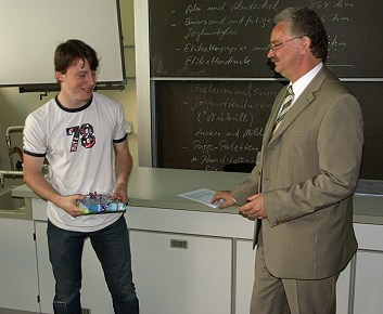 Schulpreis für herausragendes schulisches Engagement an Jonas Gumb Jonas Gumb mit Direktor Helmut Schultz bei der Preisverleihung (Foto:HSG)(jc) (hsg) Zum Schuljahresende vergab eine Jury, bestehende aus Vertretern der Elternschaft, der Schüler und der Lehrkräfte den Schulpreis für herausragendes schulisches Engagement an den Schüler der 12. Klasse Jonas Gumb. Dieser Preis, der nach einer Idee aus der Elternschaft jedes Jahr an einen Schüler vergeben wird, der sich vorbildlich für die Belange der Schülerschaft und der Schule insgesamt eingesetzt hat, wurde am letzten Schultag von Oberstudiendirektor Schultz an Jonas Gumb übergeben. Direktor Helmut Schultz würdigte dabei besonders den Einsatz von Jonas Gumb vor allem auch als Berater und Vorbild von jüngeren Schülern.