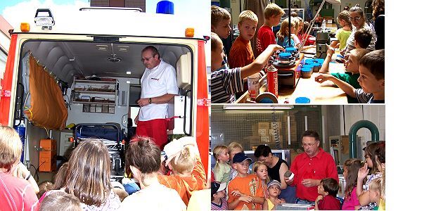 Heute ging’s zum Roten Kreuz und zur Firma Platt Rudolf Kübler erklärt den Krankenwagen (links), Bürstenherstellung in der Firma Platt (rechts oben, Dr. Ulrich Rietdorf erzählt, wie man Bürsten macht (rechts unten). (Fotos:Koss)(ak) Guten Zuspruch erfuhr das Ferienspaß-Programm der AWO auch heute wieder. Rund 70 Kinder, in zwei Gruppen aufgeteilt, besuchten das Deutsche Rote Kreuz (DRK) und erfuhren hier, welchen Aufgaben sich diese Organisation verschrieben hat. Anschließend durften ein Krankenwagen und ein Rettungswagen besichtigt werden, und bei der Demonstration eines EKG-Gerätes erfuhr das getestete Mädchen, dass sein Herz pflichtgemäß schlägt. Zum Abschluss spendierte das DRK ein Erfrischungsgetränk und ein Eis.