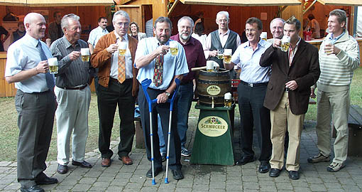 Auf einen guten Verlauf des Mülbener Dorffestes im Kurpark erhoben nach dem Fassanstich die Ehrengäste Klaus Schütz aus Kobersdorf, Ehrenbürger Gerhard Hauck, Bürgermeister Klaus Schölch, Ortsvorsteher Peter Ihrig, Kreisrat Norbert Bienek, Gemeinderat Erich Steck, MdB Kurt Segner, Kreisrat Herbert Münkel, Ortsvorsteher-Stellvertreter Markus Haas und Bernd Csik von der Fa. Getränke Weis ihre Gläser.