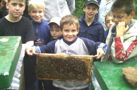 Keine Berührungsängste bei den jungen Imkern (Foto:privat)(tw) (ro) Vom vergangenen Samstag bis zum Montag besuchten elf Eberbacher Kinder im Rahmen des Ferienprogramms täglich die Imkerei von Herbert und Rainer Olbert in Friedrichsdorf. Rainer Olbert, der auch Vorsitzender des Eberbacher Imkervereins ist, vermittelte den interessierten Kindern und einigen Eltern, die sich kurzerhand der Kindergruppe angeschlossen hatten, in der Theorie und Praxis alles Wissenswerte über die Imkerei. Unterstützt wurde er durch den Imkerkollegen und Diplombiologen Berthold Heil, der die Aktion im Rahmen des Ferienprogramms begleitete. Die Gruppe lernte viel über das Leben der Bienen, den Umgang mit ihnen, welche Arbeiten notwendig sind, um an den kostbaren Honig zu kommen und wie man bei richtigem Verhalten sogar ohne besondere Schutzkleidung im "Bienen-Gewimmel" arbeiten kann. Mehrmals wurde ein Bienenvolk geöffnet und Arbeiten durchgeführt. Dabei wurde niemand gestochen. Die Gruppe lernte den Unterschied zwischen Bienenmann, dem Drohn, Bienenfrau, der Arbeiterin, und der Königin kennen. Interessant war es auch zu erfahren, dass für ein Glas Honig alle daran beteiligten Bienen zusammen eine Strecke zurücklegen müssen, die etwa dreimal um die Erde führen würde. Etwas "zum mit nach Hause nehmen" gab es auch. Aus Altwaben wurde naturreines Bienenwachs recycelt aus dem die Kinder Kerzen rollten, zogen oder gossen. Das Bienenwettfliegen, auf das sich alle Kinder gefreut hatten, musste leider wegen schlechten "Flugwetters" abgesagt werden.