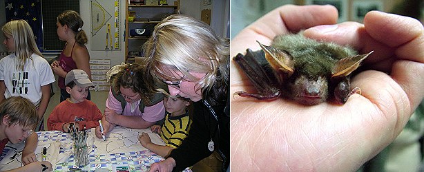 Ab 20 Uhr hatten die über 50 teilnehmenden Kinder die Möglichkeit an Basteltischen, durch einen Videofilm, gemütlich im Vorlesezelt und am Spieltisch vieles über das Leben der einheimischen Fledermausarten zu erfahren. Einige Eltern ließen sich von den Fledermausexperten vor Ort über den Bau und das Anbringen von Fledermauskästen oder die fledermausfreundliche Bepflanzung ihres Gartens beraten. Im Dachboden der Dr. Weiß-Grundschule versammelt sich jedes Jahr eine Gruppe von Fledermausweibchen, in diesem Jahr ca. 120 Tiere, um gemeinsam ihre Jungen zu gebären und aufzuziehen. Bei den Fledermäusen kann man unterschiedliche Arten bestimmen und die in der Schule lebenden, gehören zu den Großen Mausohrfledermäusen. Eine Begehung des Dachbodens um die Fledermäuse zu sehen, zu beobachten wäre eine enorme Störung der scheuen Tiere und würde die Aufzucht der Jungtiere gefährden. Da die Fledermäuse vom Aussterben bedroht sind, ist eine solche Störung strengstens verboten. Allerdings konnten die Kinder den Beutefang-Ausflug der "Mausohrenmütter" zwischen 21.30 und 22.30 Uhr vom Schulhof aus beobachten. Leider zeigten sich nur wenige Tiere, vielleicht waren die Beobachter zu laut? Trotzdem verabschiedeten sich alle Kinder mit zufriedenen und lachenden Gesichtern, da sie "Groki", den zahmen Fledermauspflegling, der öffentliche Auftritte gewohnt ist, zum Abschied streicheln durften.