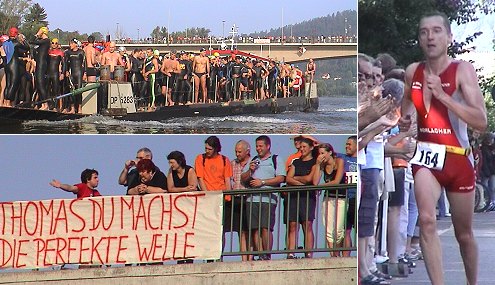 Um 9 Uhr gab Sportausschussvorsitzender Dieter Jeitner den Startschuss fürs Schwimmen. Es ging vom RGE-Bootshaus flussabwärts zur DLRG-Station, und Hunderte Fans auf der Neckarbrücke feuerten die Schwimmer an. Die Wechselzone hatten die Organisatoren vom Skiclub "Grummer Stegge" und von der DLRG vor dem Freibadeingang eingerichtet. Nach knapp 8 Minuten schwangen sich die ersten Triathleten aufs Rad für die Strecke hinauf nach Schwanheim und wieder zurück, wo dann noch die 6 km lange Laufstrecke nach Pleutersbach und zurück auf die Sportlerinnen und Sportler wartete.