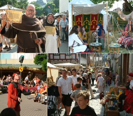 Mittelalterliches Treiben bei herrlichem Sommerwetter (Von oben links) Mönche mit Ablassbriefen erwarteten einen schon am Eingang zum historischen Dorf, Sarazenen hatten ein maurisches Lager aufgeschlagen und weideten ihre Dromedare. Hubertus zu Putlitz begeisterte mit seinen Jonglierkünsten und auch in der Innenstadt herrschte buntes Treiben. (Fotos:Wörner)(tw) Am vergangenen Wochenende präsentierte sich Hirschhorn wieder ganz mittelalterlich. Bereits zum 29. Mal hatte die Carnevalgesellschaft Hirschhorner Ritter 1967 e.V. zum Ritterfest eingeladen. Mit Ritterlager, Gauklern, Bettlern, Spielleuten Arkrobaten und kunstvollem Handwerk wartete das bunte Lagerleben im historischen Handwerkerdorf rund um den Chateau-Landon-Platz für die staunenden Besucher auf. Auf der Showbühne gab es Ritterkämpfe, mit den Rittern des "Peter von Habenichts", Jonglage und Narretei mit dem Gauklerduo "Forzarello" und mit "Hubertus von Putliltz" sowie orientalischen Tanz mit Tänzerin "Lux Aeterna". Im Ritterlager konnten die Besucher ihr Geschick mit mittelalterlichen Waffen erproben und sich im Bogen- und Armbrustschießen beweisen. Für die kleinen Besucher, aber ausdrücklich auch für Erwachsene hatte die "Kahlgrund-Reitschul" geöffnet, ein mittelalterliches Schiebekarussell. Zahlreiche Handwerker wie Schmied, Weber, Bogenmacher, Steinmetz, Instrumentenbauer und Gerber gaben einen Einblick in ihre Handwerkskunst und ihr mittelalterliches Leben. Exotische Düfte vom Räucherwerk, den Süßwaren und Kräutern der orientalischen Händler wechselten mit dem Duft von Gebratenem und Gebackenem das an zahlreichen Ständen den Besuchern feilgeboten wurde. Auch die Innenstadt Hirschhorns war von buntem Treiben erfüllt. Die Moritatensängerinnen der Carnevalsgesellschaft gaben Moritaten rund um Hirschhorn zum besten und historische Stände mit vielfältigem Angebot zogen sich hin bis zum Marktplatz bei der katholischen Kirche. Am Sonntagnachmittag hatten zusätzlich die Geschäfte ihre Pforten geöffnet.