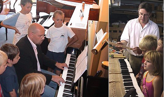 Eine Reise durch das Klavier Pianist Christian Roos ließ das Klavier ertönen, und Udo Müller zeigte das Innenleben des Instruments. (Fotos:C.Richter)(cr) Eine außergewöhnliche Reise unternahmen gestern zahlreiche Kinder im Ferienspaß-Programm. Klavierbaumeister Udo Müller lud die Kids zu einer "Reise durch das Klavier" ein. Und um gleich "in media res" einzusteigen, war die erste Frage eines Kindes: "Wann wurde das Klavier überhaupt erfunden?" So startete Müller die interessante Reise mit historischen Informationen, erklärte die Entwicklung von Cembalo, Klavier, Flügel bis hin zu heutigen modernen Klavieren. Die Kinder lernen unter anderem, dass das Klavier ein Saiteninstrument ist, sie hörten den Unterschied zwischen Klavier und Flügel, wissen nun wie ein Flügel "innen und außen" aussieht und wie es sich anhört wenn viele Kinder in einen Flügel hineinschreien. Aber nicht nur eine Reise durch das Klavier fand gestern statt, auch eine Reise durch die Räume des Klavierbaumeisters. So durften die Kinder in der Werkstatt mit Hand anlegen: Müller hatte eigens eine Klaviatur (Tastatur des Klaviers) aufgebaut, die von einigen mutigen Kindern gereinigt werden durfte. Als besonderes Highlight hatte Udo Müller einen "echten" Konzertpianisten eingeladen. Christian Roos spielte am Flügel ein Stück von Beethoven und am Klavier im Ausstellungsraum den "Root Beer Rag" von Billy Joel.