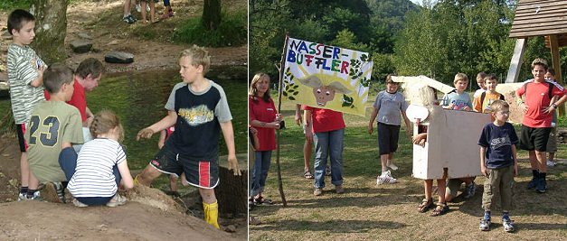 Familienabend zum Ausklang der Ferienspiele (Fotos:privat)(hr) (ct) Bei strahlender Sonne und sommerlichen Temperaturen wurden vorgestern die Ferienspiele 2005 der "Arche" mit einem Abend für die ganze Familie beendet. Zahlreiche Eltern kamen schon frühzeitig auf den Jugendzeltplatz im Ittertal und hatten dort Gelegenheit, sich von ihren Kindern zeigen zu lassen, was sie an den Tagen und vor allem am Freitagnachmittag gemacht hatten. Stolz wurden die Werkstücke gezeigt, die in den Workshops am Freitag hergestellt wurden. Es waren Safaritaschen, afrikanische Lampen mit Serviettentechnik, Pfeil und Bogen, allerlei aus Bienenwachs, Perlen, Bändern und Gasbetonsteinen. Großes Interesse fand auch das professionell gesicherte Baumklettern. Und auch die Itter zog wieder viele in Ihren Bann, und mancher wurde ziemlich durchnässt.