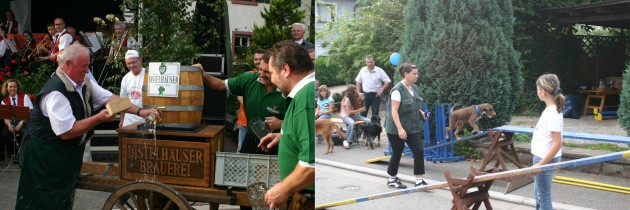 Haag lockte wieder mit einem Straßenfest Bürgermeister Roland Schilling eröffnete die 13. Haager Backtage mit viel Prominenz ein. Die Haager Hundeschule führte Kunststücke vor. (Fotos: Böhm)(ub) Mit einem Straßenfest rund um das restaurierte Haager Backhaus lockten die örtlichen Vereine am Wochenende viele Besucher in ihr schönes Dorf. Hobby- Bäcker Manfred Brückner und seine zwei "Gesellen" zeigten, wie man auf traditionelle Weise im Holzofen Brot backt. Mit einem reichhaltigen kulinarischen Angebot verwöhnten die Haager die Gaumen der kleinen und großen Besucher, die Hans- Jürgen Heiß und Bürgermeister Roland Schilling zu den 13. Backtagen willkommen hießen. Schilling freute sich über den Besuch von MdL Elke Brunnemer, Bürgermeister Otto Eckert aus Reichartshausen und Kollege Bernhard Martin aus Eberbach. Für die Eberbacher hatte er ein besonderes Bonbon parat. Nachdem das Gewerbegebiet "GIP" vorerst auf Eis gelegt sei, denke er und sein Gemeinderat darüber nach, als weitere Einnahmequelle Mautgebühren von den Eberbachern zu erheben. Nach der offiziellen Ansprache war es wieder soweit- das Bierfass musste angestochen werden. Mit einigen Schlägen war es der Zapfhahn leid und ließ sich von Schilling ins mitgebrachte Holzfass der beiden Festwirte Siegfried Boch und Roland Brand treiben. Mit dem kühlen Nass gestärkt, lauschten die Besucher nach dem Fassbieranstich den Klängen der Musikkapelle Neckarbischofsheim. Wer Lust hatte, konnte sich auf dem Kinderflohmarkt mit netten Accessoirses eindecken oder im Vergnügungspark Kinderkarussell fahren. Erstmals zeigten die Haager Hundefreunde mit kleinen Vorführungen ihr Können und hatten so manchen Parcours vorbereitet, den die Hunde freudig bewältigten. Am 25. September wollen sie das 2. Gauditurnier für jedermann und – hund an der Haager Grillhütte durchführen. Gestern Abend spielte die Liveband "Sirious" mit einer Open Air Party auf, ehe heute die Backtage mit Musikveranstaltungen des Musikvereins Waldwimmersbach, dem Kinderchor des MGV Haag und des Musikvereins Reichartshausen ausklangen. Das traditionelle Kuhroulette durfte als Höhepunkt der Veranstaltung nicht fehlen. Für die Besucher der 13. Haager Backtage hatte Hubert Göhrig noch ein besonderes Highlight vor Ort vorbereitet. In stundenlanger Handwerksarbeit sägte er mit einer Motorsäge einen mannhohen Bär aus einem Baumstamm heraus. Am Ende der Backtage wurde dieser Bär zugunsten des örtlichen Kindergartens verlost.