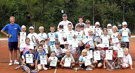 Tennisspaß für Kinder (Foto: privat)(bro) (jsch) Während der letzten Ferienwoche haben 28 Kinder im Alter von sechs bis zwölf Jahren am Tennisferiencamp auf der Platzanlage in der Au teilgenommen. Von 9 bis 15 Uhr, unterbrochen durch ein gemeinsames Mittagessen, wurde mit Begeisterung Tennis gespielt. Mittwochs machte die Gruppe mit ihren Betreuern einen Ausflug in den Hochseilgarten Forest Jump in Walldürn, wo Teamaufgaben zu lösen waren und jeder seinen Mut testen konnte. Zum Abschluss fand freitags eine Funolympiade statt. Teebeutelweitwurf, Erbsenweitspucken und vieles mehr standen auf dem Programm. Alle Teilnehmer bekamen eine Urkunde und freuen sich schon jetzt auf das Tenniscamp im nächsten Jahr.