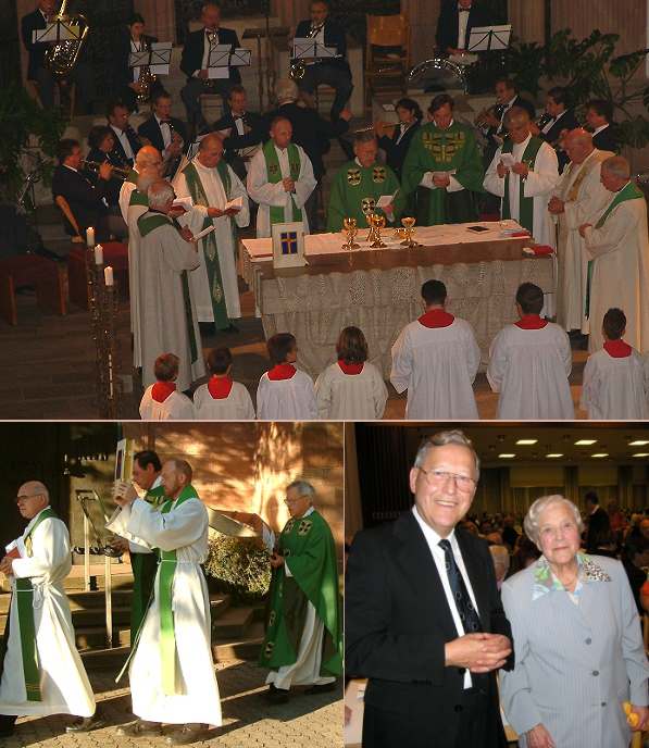 Eine feierliche Messe stand am Anfang des Abends, an dem viele Eberbacher Katholiken sich aufgemacht hatten, um noch einmal gemeinsam mit ihrem Pfarrer Eucharistie – "Danksagung" – zu feiern. Auch musikalisch wurden dabei alle Register gezogen: die Pfarrkapelle unter ihrem Leiter Gustav Rumstadt, Kantorei und Singkreis unter dem Dirigat von Bezirkskantor Godehard Weithoff musizierten abwechselnd und gemeinsam.
