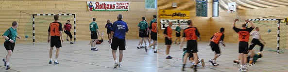 Ähnlich verlief das Spiel der 2. Herrenmannschaft. Stark ersatzgeschwächt musste man mit nur einem Auswechselspieler gegen die Zweite des PSV Heidelberg antreten. Auch hier konnten die Spieler der HGE ein schnelles 1:3 nicht verhindern. Erst als der Gegner sich selbst dezimierte, indem er unkontrolliert in die Zweikämpfe ging und dadurch 2 Spieler durch Rote Karten verlor, konnte man das Spiel wenden. Gegen teilweise nur 4 Heidelberger gelang dann der Ausgleich zum 7:7. Mit einer Leistung von Licht und Schatten geprägt, wechselten die Mannschaften beim Stand von 14:14 die Seiten. Ständige Führungswechsel beherrschten das Spiel in der 2. Halbzeit. Glücklich konnte die HGE in der Schlussminute das 27:26 erzielen und damit auch das Spiel für sich entscheiden.