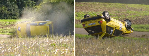 MSC Rallyeteam beendet Saison mit Totalschaden Szenen des Unfallhergangs(Fotos:privat)(jc) (py) Lange war es ruhig um das Vater und Sohn Rallyeteam des MSC Eberbach. Peter und Pascal Palmer nahmen zwar an sechs Rennen teil, schieden aber immer in aussichtsreicher Position mit technische Problemen aus. Mal waren es die Antriebswellen die rissen, dann spielte die Schaltung verrückt. Hatte die Saison noch sehr gut angefangen so musste man sich plötzlich dem Defektteufel geschlagen geben, der erbarmungslos zuschlug. Trotzdem machte man sich hoch motiviert auf zur Rallye Lebacher Land im Saarland, die technischen Gebrechen schienen beseitigt. Die ersten vier Prüfungen liefen auch recht gut, man lag in der stark besetzten Klasse H bis 2000ccm unter den ersten fünf. Peter Palmer fuhr in der 5. Sonderprüfung voll auf Angriff. Schaltete kurz vor der ominösen Kuppe noch in den 5. Gang und hob ab. Doch die Landung wurde zum Problem, der Golf versetzte kurz und kam von der Strecke ab. Was nun folgte war eine Serie von Überschlägen, die zum Glück vom weichen Boden und dem Gebüsch gedämpft wurden. Schließlich blieb man auf dem Dach liegen. Geschüttelt aber nicht gerührt entstieg man unverletzt dem Wrack. Hier hatten die Sicherheitszelle, die Sitze und die Vierpunktgurte alles abgehalten. Zwar hatte man schon zur Frankenland-Rallye am 8. Oktober zum "Heimspiel" im Raum Buchen, Walldürn, Sindolsheim genannt, doch wenn man keinen günstigen Leihwagen bekommt dürfte die Saison beendet sein. Die Verhandlungen über die Anmietung eines Rallyefahrzeuges laufen. Über den Winter wird dann ein neues Auto aufgebaut