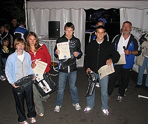 TVE-Kerweflitzer holten Silber in Schönau (Foto: privat)(bro) (td) Gleich mit zwei Mannschaften à vier LäuferInnenn reisten die Eberbacher Leichtathleten nach Schönau zum dortigen 1. Kerwelauf. Neun Mannschaften starteten rund um den Kerweplatz 3,5 km durch die Schönauer Straßen. Novum war die offene Mannschaftseinteilung von Schüler bis Senioren männlich oder weiblich innerhalb eines Teams. Die mit Abstand jüngste Mannschaft bildeten die Zwillinge Andreas und Alexander Scheffner mit ihrem Bruder Hannes und Maxim Koch, die als "TV-Scheffner-Bande" antraten und mit einer feinen Leistung der Zwillinge einen guten 4. Platz belegten. Schneller noch waren Jana Mertes, Giulia Nohe, Moritz Schöpf und Jan-Philip Kaufmann, die als "TVE-Kerweflitzer" in der Endabrechnung den überraschenden 2. Platz herausliefen. Hierbei fiel vor allem Jan-Philip Kaufmann auf, der als 2. Einzelläufer im Ziel großen Vorsprung vor den Aktiven hatte. Beide Mannschaften konnten sich somit als reine Schülerstaffeln gegen die Aktiven und Jugendlichen sehr gut in Szene setzen. Nach zwei Runden Boxauto auf der Kerwe ging es mit Preisen beladen in normaler Fahrt heimwärts.