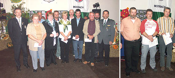 Festbankett mit Ehrungen Beim Festbankett anlässlich des 80-jährigen Bestehens des Sportschützenvereins Dielbach wurden auch langjährige Mitglieder geehrt (rechts). Das linke Bild zeigt die mit der Kreisehrennadel geehrten Mitglieder des SSV Dielbach zusammen mit Kreisschützenmeister Karl Preischel (links) und Oberschützenmeister Holger Braun (rechts). (Fotos:Baumgartner)(tb) Am vergangenen Wochenende feierte der Sportschützenverein Dielbach in seiner großen Schießhalle sein 80-jähriges Jubiläum. Mit Böllerschüssen am Freitag gab man einen markanten Startpunkt zu den Jubiläumsfeierlichkeiten, dem sich das große Festbankett, bei dem auch zahlreiche Dielbacher Vereinsmitglieder geehrt werden konnten, anschloss. Unter den vielen Gästen hierbei konnte Oberschützenmeister Holger Braun auch Bürgermeister Klaus Schölch und Kreisschützenmeister Karl Preischel begrüßen.