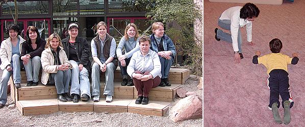 Individuelle Einzelübungsprogramme im Kiga Regenbogen (Fotos: privat)(bro) (kr) Ein Schwerpunkt der pädagogischen Arbeit im evangelischen Kindergarten Regenbogen ist Körper-, Sinneswahrnehmung und Bewegung. Das Team des evangelischen Kindergartens Regenbogen besuchte 2004 zu diesem Thema im Rahmen des Projekts "Stärkung der Erziehungskraft Familie-Kindergarten" Fortbildungen in der Praxis für Physiotherapie Janine Luck. In den Kursen wurden die Erzieherinnen im Umgang mit Restreaktionen frühkindlicher Reflexe und ihre Auswirkungen auf das Lern-und Sozialverhalten der Kinder geschult. Die Kurse beinhalteten theoretische Hintergründe zu den Restreaktionen frühkindlicher Reflexe sowie das Erkennen der individuellen Auswirkungen, als auch motorische Übungen zur Integration. Diese Erkenntnisse wurden in den Kindergartenalltag eingebaut. In Zusammenarbeit mit der Praxis für Physiotherapie Janine Luck finden für alle interessierten Eltern Einzelberatungen statt, in denen die Eltern angeleitet werden, mit ihren Kindern motorische Übungen durchzuführen. Der Kindergarten leistet mit diesem speziellen Angebot Hilfe zur Selbsthilfe.