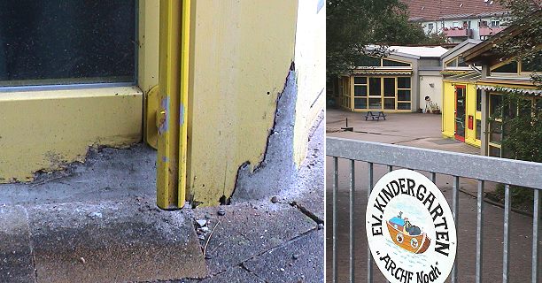 Planungsfehler und schlechte Bau-Unterhaltung sind schuld Holzfäule frisst an den Fensterelementen des Kindergartens "Arche Noah". (Fotos:C.Richter)(hr) Erhebliche Schäden an der Bausubstanz gibt es im evangelischen Kindergarten "Arche Noah" in der Berliner Straße. Wassereinbrüche, Feuchtigkeitsschäden mit Schimmelbildung infolge Kältebrücken und faulendes Holz an den Fensterelementen, die mit Erdkontakt verbaut wurden, machen eine Sanierung notwendig. Stadtbaumeister Manfred Janner macht dafür einerseits mangelnde Unterhaltungsmaßnahmen, andererseits aber auch Planungsmängel beim Umbau des Kindergartens vor rund zehn Jahren verantwortlich.