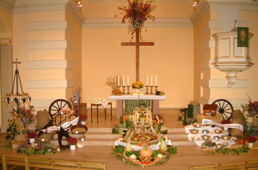 Wir pflügen und wir streuen den Samen auf das Land Schon heute schmückte das Erntedankteam unter der Leitung von Karlfrieder Peters den Altarraum in der Michaelskirche. (Foto:Wörner)(tw) Am morgigen Sonntag wird um 11.30 Uhr in der mit Erntegaben geschmückten Michaelskirche ein Erntedankgottesdienst für Klein und Groß gefeiert. Er steht unter dem Thema: Gott schenkt uns die Fülle.