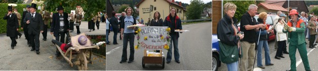 Allerlei Dorfgeschehen auf die Schippe genommen Kerwepfarrer Ralph Schweizer führte den Kerweumzug an und las den Bürgern später die Leviten. Leckeren Kerwekuchen gab´s auch. "DJ Martina" verteilte mit ihrer Gruppe wegen steigender Heizölpreise Holz an die Bevölkerung. (Fotos:Böhm)(ub) Mit sage und schreibe 23 Motivwagen wurde am Samstag der traditionelle Allemühler Kerweumzug begangen. Kerwepfarrer Ralph Schweizer eröffnete den Umzug mit der Kerweschlumpel, gefolgt von der Allemühler Blaskapelle. Allerlei Dorfgeschehen passierte Revue vor den zahlreichen Zuschauern, die vom Regen verschont blieben. So hatten die Kleinen der 25jährigen Jugendgruppe "Leuchtturm" gar gelernt, was man Leckeres in der "Suppekich" zubereiten kann und konnten sogar in einem "Kochstudio" Speisen zubereiten. Was in jungen Jahren gelernt wurde, verkosteten dann die Zuschauer. So mussten diese beim Kerwekuchen nicht darben. Ein Erlebnis von der Bundestagswahl wurde ebenfalls auf die Schippe genommen, als ein etwas kurzsichtiger Bürger gemeinsam mit seiner Frau im Wahlraum wählen wollte, der (namentlich bekannte) Wahlleiter ihn in der "Kreitzel-Stuwe" aber nicht in dieser Form wählen lassen wollte. Egal, ob Allemühler Feuerwehr, Allemühler Gesangsverein Frohsinn, Fußballmeisterschaften oder die Präsentation der Allemühler Nachwuchskicker. Alle Motivwagen, wie der von "DJ Martina", von dem Holz wegen steigender Heizölpreise an die Bevölkerung verteilt wurde, waren wie immer toll dekoriert. Politisch wurde es dann auch noch, als sich der ortsansässige Feuerwehrkommandant in privater Angelegenheit (zum wiederholten Male) wegen eines ungeklärten Wegerechts an die Öffentlichkeit wandte.